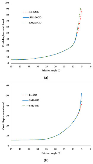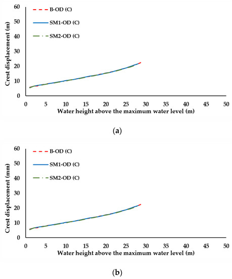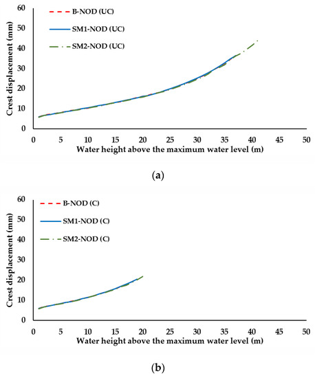 Figure 23 shows the variation in crest displacement during the process of increasing the reservoir level for the different models and keeping the uplift pressures constant or carrying out a hydromechanical analysis. The results presented highlight the relevance of taking into account the increase in uplift pressures. In fact, when the uplift pressures are kept constant (UC), higher water levels are possible when compared with the model in which the uplift pressures are recalculated according to the current water level (C). In the former case, a safety factor of around 2.0 is obtained, and in the latter case, this value is around 1.6.