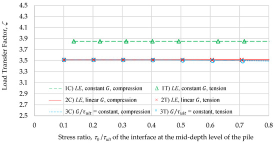 For load steps with , the shear stress at any pile depth is smaller than the ultimate value and the interface along the whole shaft remains in an elastic state. When , at any depth is equal to and the pile interface simultaneously reaches a plastic state along the entire pile length. Therefore, the estimated factor is mainly the same as the linear elastic model. The near constant value for can further be explained by the mathematical derivative of the shear strain () with respect to