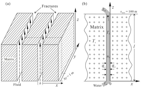 The conceptual model of a fractured reservoir is established on the basis of the previous works [16] and is shown in Figure 2. The fracture reservoir is composed of a rock matrix and independent multiple fractures (Figure 2a). The fluid in Figure 2a flows from the bottom of the fracture to the top, which is similar to how the fluid in Figure 1b flows from the deep borehole EE-1 along the fracture to the top borehole GT-2. The fracture width d in Figure 1b is denoted as in Figure 2a. The fracture length is symbolized as . The fracture height of is unified (1 m) and extendable in the y-coordinate, allowing a vast fracture to be obtained. As previously explained, the single fracture system only includes one fracture in the body of the rock (Figure 2b). The original HDR temperature is . The injected water temperature is . Water is injected into the erected fractures and is circulated at a constant speed of , and it is then heated by the hot rock to a high temperature, , at the outlet. The heat energy is abstracted by the circulating fluid from both walls of the fracture. In the 2-D coordinate system, the x-axis indicates the distance to the fracture, while the z-axis parallel to the water flow indicates the distance to the water inlet. The water inlet is designated as point (0, 0). The water outlet is (0, l). Heat conductively transfers toward the rock and water interfaces.