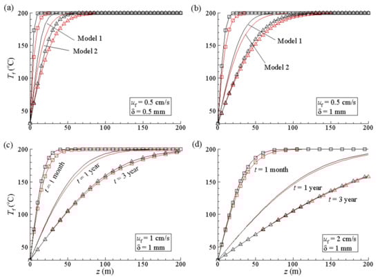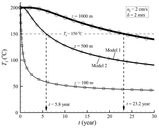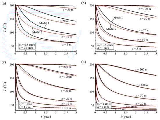 The temperature curves in Figure 4a are calculated at a water flow rate of 0.5 cm/s and at a fracture width of 0.5 mm and indicate a large temperature difference at different z values. The water temperatures calculated by Model 1 are greater than those calculated by Model 2, and the temperature difference decreases at higher z values. The temperature difference was as high as 44 °C at z = 5 m and t = 17 days and 30 °C at z = 10 m and t = 78 days and fell to 20 °C at z = 20 m and t = 1 year. Figure 4 also shows that the temperature difference decreases and even disappears with time at high z values.