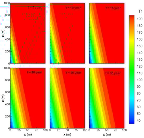 Model 1 was validated by Model 2 and can therefore be used to trace the temperature evolution of rocks. Figure 6 shows the temperature evolution of the rock at the defined reference conditions over a period of 30 years in the simulation domain (x ≤ 100 m and z ≤ 1000 m). The temperature pattern is unique because of the heat conduction type and invariable water flow. These include the following: (1) the cold zone at the water inlet, (2) the heat extraction front proceeding as a hypotenuse of a right-angled triangle, and (3) the evolution of a symmetrical low-temperature zone along the fracture.