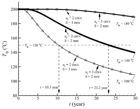 The parameter pair of the water flow rate and fracture width indicates water flow flux through the fracture. A high value of implies that more water is heated in the fracture. The water may not be sufficiently heated when it arrives at the outlet. Figure 9 shows the effect of injected water flow flux (equivalent to ) on the produced water temperature. The temperature of the produced water can be elevated by lowering the water flow flux. It is 189 °C at the smaller flux and 109 °C at the higher flux after a production duration of 30 years. Meanwhile, water flow rates have the same effects on the performance of the produced water temperature as the fracture width. For example, the produced water temperature at the = 1 cm/s and = 2 mm (solid line) pair is the same as that at the = 2 cm/s and = 1 mm (markers) pair. At this high water flux, the single fracture reservoir has a 10.3 year lifespan.