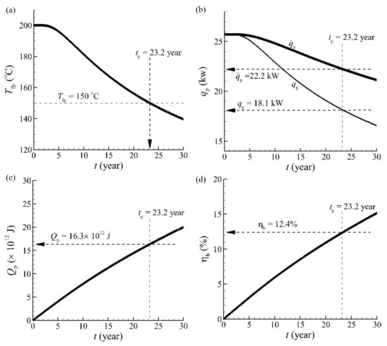 The calculations in this paper are based on the fracture rock and fluid properties and the utilizable temperature and heat–electric conversion parameters. Other factors that significantly affect the system calculations include fracture morphology, natural fluids in rock, variable viscosity and fluid density, the short circuiting of fluid between injection and production wells, and water loss to the surrounding rock during reservoir operation; however, our calculations provide a good reference to predict the heat production, recovery, and design of the geothermal reservoir.