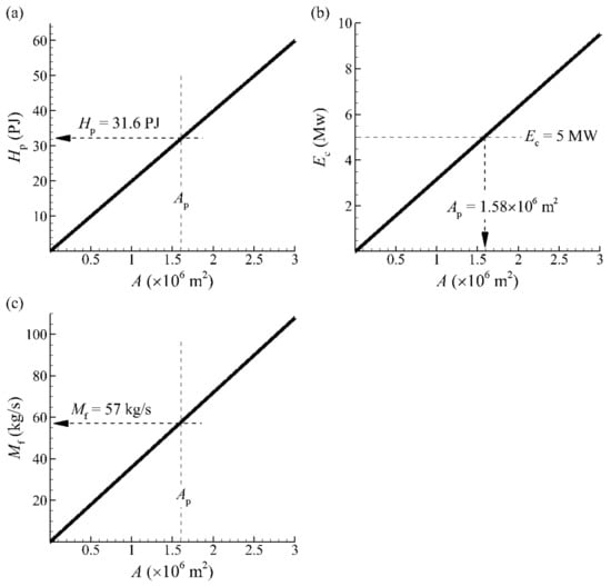 Figure 11 shows the relationships between the total area of the fracture surface and heat production, electric generation, and water injection. The electricity power is calculated assuming 15% heat to electric-power efficiency. As Equation (12) indicates, the heat production increases proportionally with the fracture surface area (Figure 11a). If a plant with a 5 MW capacity is to be installed, a minimum fracture surface area of 1.58 × 106 m2 must be prepared to sustain stable operations for 23.2 years (Figure 11b). The total geothermal energy of 31.6 PJ will be produced over the projected production duration (Figure 11a). Meanwhile, the total mass flow rate of water according to Equation (13) is 57 kg/s (Figure 11c). As noted here, the calculation is based on the reference conditions of hot rock, fracture size, and water flow. However, the predication techniques can be readily used to design fracture reservoirs.