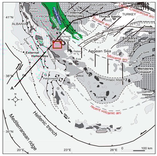 Geological map of the Hellenides with the main structural domains and their continuation to the adjacent orogenic belts []. The proposed cross-section of Figure 3 and the study area (red rectangular) are also shown [].