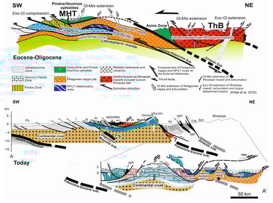 Geological cross-sections through the Hellenides during the Eocene-Oligocene and today (location in Figure 2). The geotectonic position of the MHT and THB molassic basins is shown [,]. After Kilias et al. [].