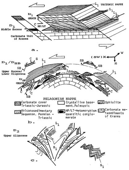 Schematic illustration of the evolutionary stages for the Tertiary deformation in the broader studied region (Kranea area). (a) D1 compression and SW-wards nappe stacking, including the HP/LT metamorphic rocks, (b) subsequent extension and crustal uplift; kinematic indicators show also a main SW-ward sense of movement during nappe denudation, (c) younger D2 compression, conjugate knick-folds and SW- or NE-ward directed thrust faults formation (detail explanation in text). After Kilias et al. [].