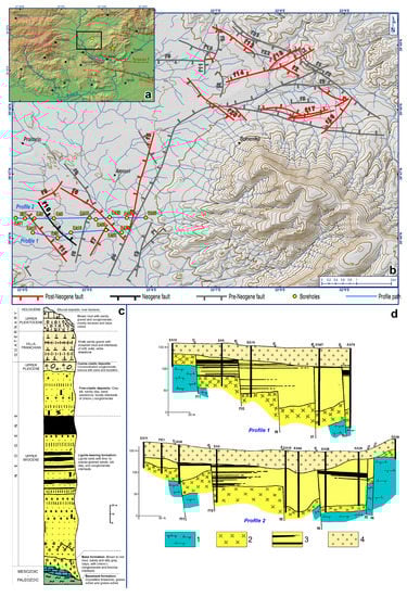 (a) Hillshade map of the broader 2021 epicentral area showing the epicentres of the strongest shocks (orange star = March 3, Mw6.3, yellow star = March 4, Mw6.0), and the neotectonic faults according to literature (for references see main text). (b) Shaded relief map exported from the 5 m-DEM of Hellenic Cadastre where the fault locations suggested by IGME’s study are shown []. The location of selected boreholes and the profile paths of inset (d) are also shown. (c) Synthetic stratigraphic column of the Neogene formations of the Elassona Basin, according to the above study (after Dimitriou and Giakoupis [] modified). (d) Interpreted profiles based on borehole data []. Lithology is simplified: 1 = alpidic basement, 2 = base formation (Upper Miocene), 3 = lignite-bearing formation with the fine- and coarse-clastic deposits (Upper Miocene-Villafranchian), 4 = Quaternary deposits (Upper Pleistocene-Holocene). After Galanakis et al. [].