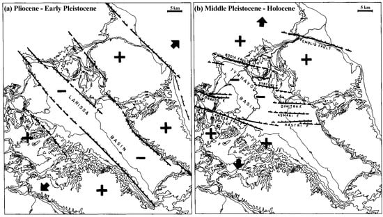 The latest two extensional phases, (a) during Pliocene-Early Pleistocene and (b) Middle Pleistocene-Holocene, corresponding respectively to P2 and P3 phase in Figure 7, which tectonically formed the local relief of north Thessaly. Positive and negative signs indicate uplift and subsidence respectively. Modified from Caputo et al. [].