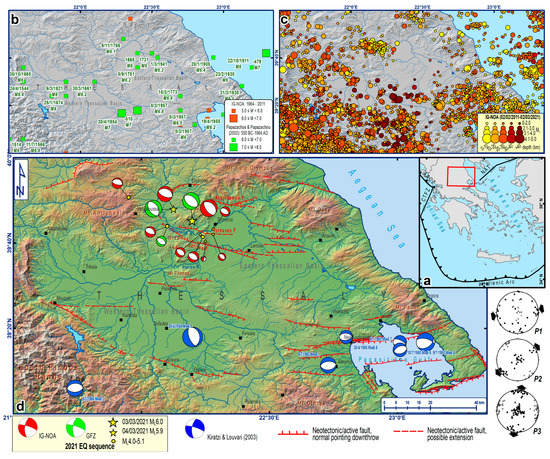 (a) Reference map. (b) Historically-early instrumentally (550 BC-AD 1964; []) and instrumentally (1964–2011) [] recorded seismicity in Thessaly. (c) Recent (2011–2/3/2021) seismicity in Thessaly []. (d) Shaded relief map of Thessaly showing the major neotectonic/active faults, and the diachronic [] and the 2021 sequence’s [,] focal mechanisms; yellow stars represent the two strongest earthquakes (larger star = first strongest, smaller = second strongest). The late alpine compressional (P1) and the post-alpine extensional (P2 and P3) tectonic phases after Caputo & Pavlides [] are shown at the bottom-right. After Chatzipetros et al. [].