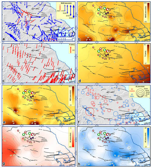 (a) Maximum Horizontal Extension (MAHE) as vectors and (b) interpolated. (c) Total Velocity (TV) as vectors and (d) interpolated. (e) Maximum Shear Strain (MSS) interpolated. (f) Area Strain (AS) as circles and (g) dilatation and (h) compaction interpolated. The major neotectonic/active faults and the moment tensor solutions [,] of the 2021 seismic sequence (Figure 7d) are also shown. After Lazos et al. [].