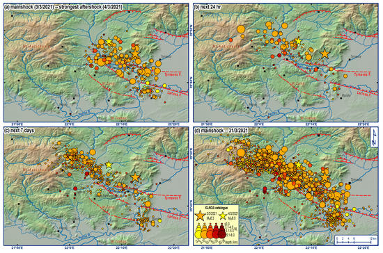 Spatiotemporal distribution of the 2021 earthquake sequence (epicentres from IG-NOA []) for the following periods: (a) from the first to the second strongest shocks, (b) for the next 24 h after (a), (c) for the next 7 days after (b), (d) the whole sequence until the end of March. Modified from Galanakis et al. [].