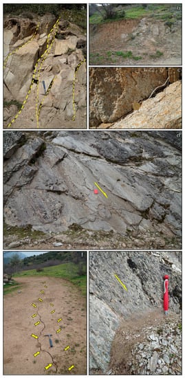 (a) Cataclasite and opening (yellow dashed lines with the thick one indicating the major opening) in Paleozoic crystalline rocks, (b) a zone of intense brittle shearing, accompanied by fault gouge and cataclasite within the Zarkos fault zone, (c) opening along a pre-existing shear zone, (d,e) fault surfaces of the Zarkos fault zone (yellow arrow shows the slip direction), (f) co-seismic surface fissures in the soil cover marked by the yellow arrows, following the inferred strike and location of the causative fault zone in the bedrock. Modified from Chatzipetros et al. [].