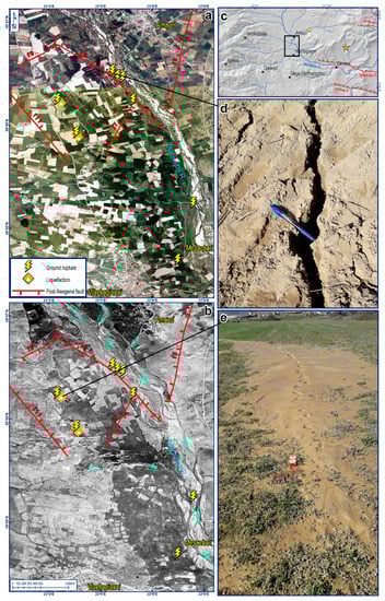 (a,b) Photomosaic of the epicentral area where ground deformation phenomena were observed. The ‘post-Neogene’ faults of IGME’s study [] are also shown. In (b), the flow direction of the Elassonitis-Titarissios river and its tributaries is marked with light-blue arrows. Both photomosaics are obtained from the Hellenic Cadastre, dated in 2016 (a) and 1945–1946 (b); their location is shown on the hillshade map (c). Co-seismic ground ruptures (d) also associated with liquefaction (e). The general trend of the ruptures is NW-SE. After Galanakis et al. [].