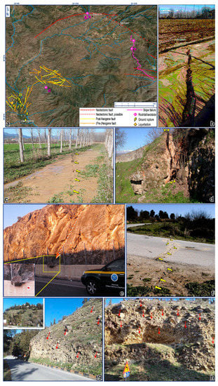 Ground deformation phenomena observed in the epicentral area of the 2021 earthquake sequence. (a) Satellite image with the locations of the ground deformation phenomena, the faults detected by Dimitriou and Giakoupis [] (see also Figure 5b), and the neotectonic faults found in the literature (see also Figure 7d). (b,c) Ground ruptures (marked by yellow arrows) with liquefaction. (d) Gneiss-schist boulder detachment in Domeniko village. (e) Rockfalls along the Tyrnavos-Elassona highway. (f) Ground rupture (marked by yellow arrows) cutting through the asphalt road. (g,h) Rockfalls near the Panagia Olympiotissa Monastery (Elassona). Locations of all photographs are shown in (a). After Galanakis et al. [].