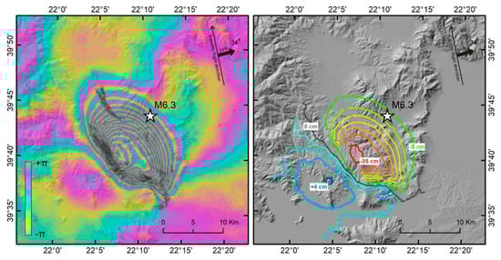 Co-seismic differential interferogram of the first main event (March 3) using Sentinel-1 pre- (25 February 2021) and post-event (3 March 2021) scenes acquired along the ascending 102 orbit (left) and extracted displacement contours after phase unwrapping (right). The reference point is located outside the shown frame. The maximum displacement calculated is 35 cm on the subsiding hanging wall of the seismic fault [].