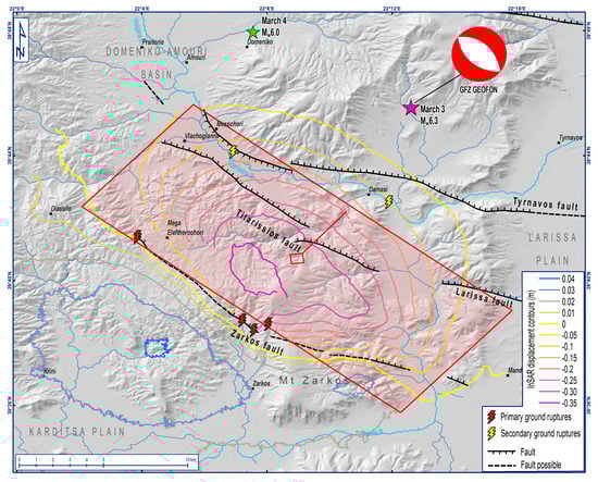 Map of the earthquake effects of the first strong shock (March 3): coseismic ruptures and InSAR displacement contours of Figure 13 []. The neotectonic/active faults, the March 3 (Mw6.3) seismic source (red rectangular, after Chatzipetros et al. []) with its corresponding moment tensor solution (GFZ GEOFON []), and the epicentres of the strongest shocks (March 3 and 4; IG-NOA []) are also shown.