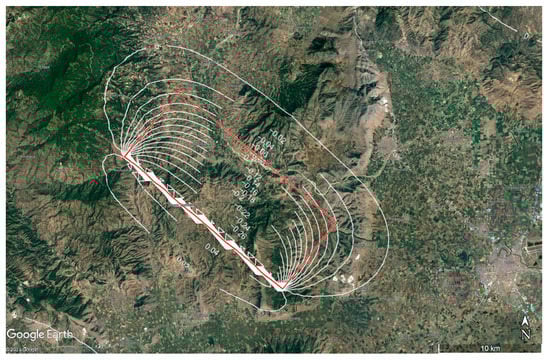 Song et al. [], using InSAR techniques to model the fault plane, showed that all three successively occurring events (March 3, 4, and 12) were characterised by normal dip-slip kinematics on previously unknown faults confined in the upper 15 km of the crust. In particular, the March 3, Mw6.3 earthquake ruptured a NE-dipping fault (301° strike and 46° dip), producing a maximum slip of ca. 2.2 m. The slip motion of the March 4, Mw5.9 aftershock showed a similar fault geometry (297° strike and 42° dip), but with a considerably smaller dip-slip component (~0.8 m).