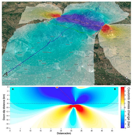 The seismic fault model (seismic source) of Figure 14 and the Coulomb static stress changes in horizontal (top) and vertical (bottom) sections that caused for receiver-faults similar to the first mainshock’s source-fault at the depth of 8 km. Modified from Chatzipetros et al. [].