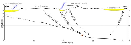 Schematic profile showing the proposed tectonic model for the first mainshock (3 March, orange star indicates the hypocentre). Modified after Chatzipetros et al. [] and Pavlides & Sboras [].