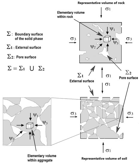 where nj denotes the local boundary surface normal vector, and ti denotes the tension acting on the boundary at a point. Specifically, the solid phase of a representative volume is subjected to a stress σsij acting over Σ1 and a pressure, p, acting on Σ2. The pore pressure at the moment is assumed here to be uniform within the representative volume.