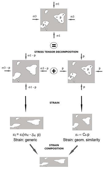 - The stress field associated with the second term on the right side of Equation (14), (p δij), which is now applied over Σ1 and Σ2, i.e., the whole boundary surface, is a well-known solution consisting of a uniform isotropic pressure equal to p (see Ref. [42]) for whatever boundary or pore surface shape, whereas the stress at a point associated with the first term (σij − p δij) is an unknown tensor, ψ0ij = ψ0ij(σkl − p δkl), which depends only on the differential stress (σkl − p δkl) (Figure 3). We are not interested in calculating the solution ψij for each point but at achieving information about its features, namely at comparing the local stress and strain fields in a porous medium subjected to a pore pressure, with those into an identical one in dry condition.