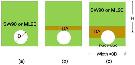 Before defining the conditions of the trenches, it is important to state the terminology of the pipe sections to avoid confusion to the readers; this terminology is shown in Figure 1. In addition, three configurations are considered for the trench to address the aim of the study as shown in Figure 2a–c. For trench configuration 1, the buried pipe is surrounded by either SW90 or ML90 soils (shown in Figure 2a). This configuration corresponds to Type 2 condition for the pipe installation according to the AASHTO [27]. Trench configuration 2 comprises of a buried pipe surrounded by SW90 or ML90 soils, while the backfill comprises of a layer of the TDA with a thickness of 150 mm on top of the pipe crown, followed by SW90 or ML90 soils as shown in Figure 2b. Trench configuration 3 comprises of a buried pipe surrounded by SW90 or ML90 soils in the bedding and haunch areas, and TDA in the shoulders and on top of the crown followed by SW90 or ML90 soils as detailed in Figure 2c.