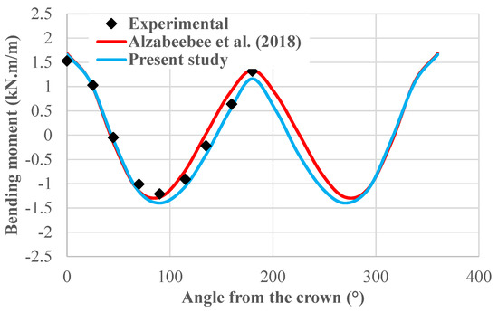 Figure 4 compares the results of the bending moment developed in the concrete pipe wall obtained from the present study and the experimental results of MacDougall [43]. The figure also reports the results of the same problem obtained by Alzabeebee et al. [27], who used the same problem to validate the results of Midas GTX/NX software package. By looking at Figure 4, it can be noticed that there is a good agreement between the results obtained from the present study and the full-scale test results. In addition, the obtained results are also in good agreement with the results of the numerical model of Alzabeebee et al. [27]. Therefore, it is obvious that the model developed in the present study is capable of capturing the observed behavior. Thus, these results give certainty in the methodology adopted in this study.