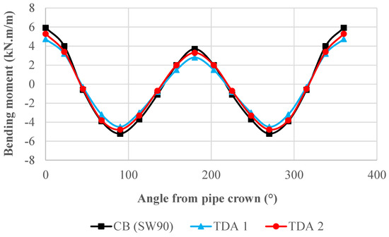 Firstly, the effect of the TDA configuration on the distribution of the bending moment around the pipe wall is examined by inspecting the bending moment developed in the pipe wall for the case of the conventional backfill using SW90 soil (CB (SW90)), conventional backfill using ML90 (CB (ML90)), TDA configuration 1 (TDA 1), and TDA configuration 2 (TDA 2). The case of a backfill height of 1.0 m is selected for this task. Figure 5 and Figure 6 present the results of the effect of the TDA configuration on the distribution of the bending moment for SW90 backfill and ML90 backfill, respectively. The angle from the pipe crown in both figures is measured as indicated in Figure 1. Looking at Figure 5 and Figure 6, it is clear that both figures show that the presence of the TDA reduces the bending moment, however, it does not influence the trend of the relationship of the developed bending moment in the pipe wall. In addition, it is also clear that the TDA 1 achieved lower bending moment values compared to the TDA 2 and for both backfill cases (SW90 and ML90).