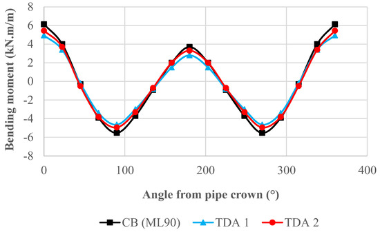Comparison of the bending moment developed in the pipe wall for conventional backfill using ML90, TDA 1, and TDA 2 for ML90 backfill.