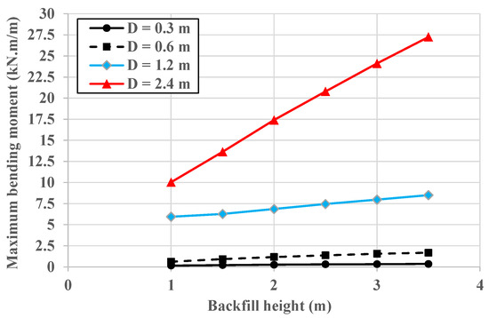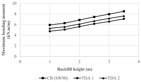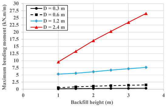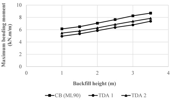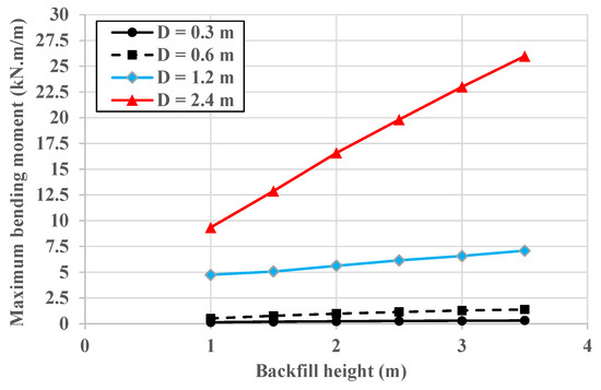 Finally, it is worthy to state that the results seem to be inconclusive for Figure 7, Figure 8, Figure 11, Figure 12 and Figure 13 and there is no backfill height at which the increase of the bending moment stops. As stated earlier, this is due to the increase of the soil weight as the backfill height rises and, thus, there is no point at which the increase of the bending moment stops due to the continuous increase of the soil weight.