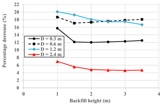 Figure 14 and Figure 15 show the percentage decrease of the maximum bending moment due to the use of TDA 1 and TDA 2, respectively. For both TDA configurations in general, the percentage decrease rises as the diameter changes from 0.3 m to 1.2 m, then significantly declines as the pipe diameter becomes equal to 2.4 m. This could be justified by the complicated interaction between the soil arching and the increase of the weight of the soil applied on the pipe for the case of a pipe with a diameter of 2.4 m. In addition, it is evident that the percentage decrease declines as the backfill height rises and then stabilizes at a certain backfill height. The stabilization of the percentage decrease means that the arching factor stabilizes at a certain backfill height.