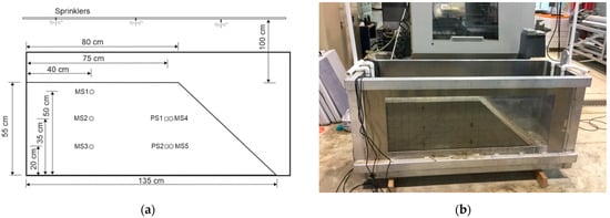 Flume apparatus: (a) location of the pore water pressure sensors (PS1 and PS2) and water content sensors (MS1-MS5); (b) an image of the slope prior to testing.