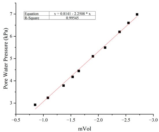 The water content was measured in 5 different locations (MS1 to MS5), as schematically shown in Figure 2a, to obtain a better idea of moisture distribution in the whole slope during a rainfall event. The water content sensors were commercially available MP306 sensors. Pore water pressure sensors (T5) with a capacity of −85 to 100 kPa were used to measure the changes in soil suction and pore water pressure generation (PS1 and PS2 in Figure 2a). The sensor was carefully calibrated before each experiment, and the accuracy was verified by detecting the current variation of the sensor data in water at different depths in relation to the actual pressure. Figure 3 shows a typical calibration curve with an error of less than 1.0%.