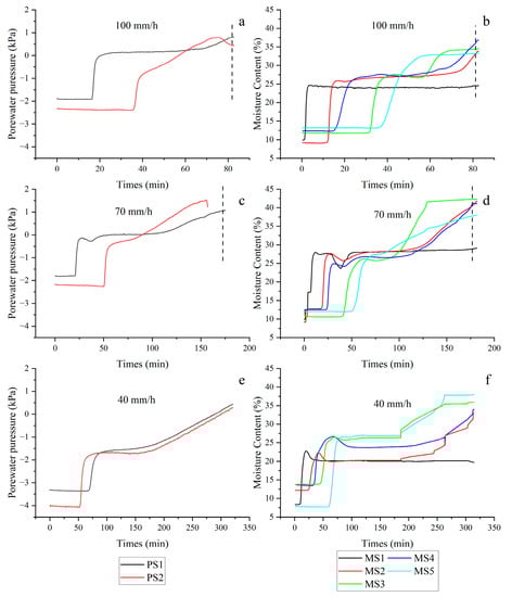 Time series data of pore water pressure (a,c,e) and water content (b,d,f). The following values rainfall intensity were used: 100 mm/hour (a,b), 70 mm/hour (c,d), and 40 mm/hour (e,f).