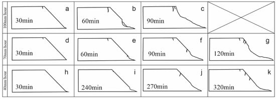 Slope failure patterns associated with different rainfall intensities: 100 mm/h (a,b,c), 70 mm/h (d,e,f,g) and 40 mm/h (h,i,j,k). Explanation is provided in the text.