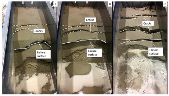 Typical examples of the progressive slope failure observed in the flume experiments with rainfall intensities of 70 mm/h (a,b) and 100 mm/h (c).