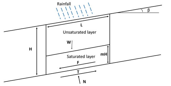 In this theoretical model (Figure 7), the potential landslide mass is divided into two parts: a saturated layer at the bottom and an unsaturated layer near the surface. The boundary between these two layers is defined by a parameter called m, which can vary over time depending on the amount and intensity of a rainfall event. The saturated layer is represented by mH, where 0 < m < 1, and H is the height of the slice, as shown in Figure 7. The unsaturated layer thickness is calculated as (1 − m)H. The parameter mH depends on the total amount of rainfall (h) and the soil degree of saturation (Sr) [24], as shown in Equation (1).