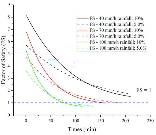 The outcome of the numerical analysis was the factor of safety (FS) obtained for each rainfall intensity and the initial moisture content. The change in FS over time for each simulated rainfall event is given in Figure 8. In this numerical analysis, when FS became less than one, slope failure was considered to occur. The time to reach failure for each rainfall intensity is given in Table 3.