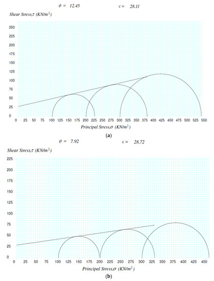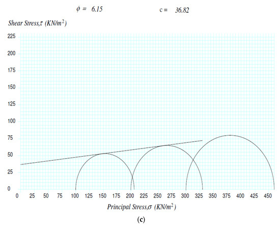 The result of the UTC test for Trial pits 1, 2, and 3 are shown in Figure 1a–c and the shear strength parameters are tabulated in Table 2. All these soil samples are C − Φ soils with high cohesion and minimal angle of internal friction. These characteristics justify the use of the soils for plate load testing using the innovative plate load testing equipment. Figure 1a–c shows that the angle of internal friction (ϕ) of the three soil samples were found to be 13°, 8° and 6° for the samples from Trial pits 1, 2 and 3, respectively.