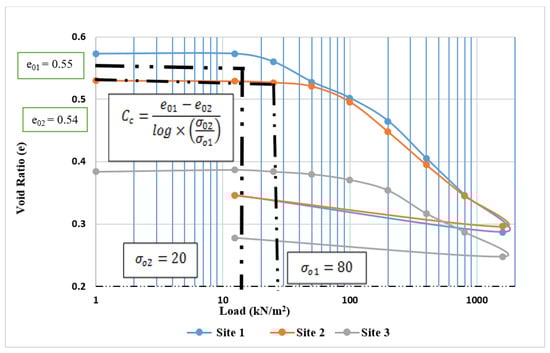 According to the results of the laboratory tests (oedometer and triaxial tests), Figure 11 and Figure 12 site 2 show a high settlement of 45.77 mm, followed closely by Site 3 with a settlement value of 43.86 mm, while Site 1 soil has the lowest settlement value of 31.5 mm. For the allowable bearing capacity, Site 1 has an allowable bearing capacity of 105.38 kN/m2, which is closely followed by Site 3, with an allowable bearing capacity of 90.06 kN/m2. Site 2 has the least allowable bearing capacity of 77.56 kN/m2, and these results are related to those reported by [34].