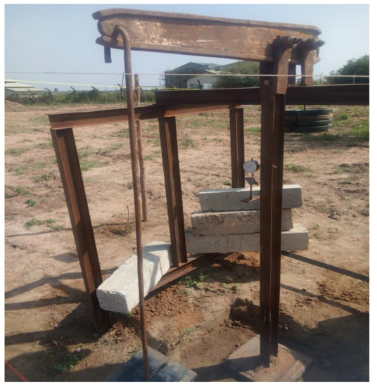 The test using the proposed innovative plate load test was carried out on a 1.5 by 1.5 m square pit with a 0.5 m depth using a square plate of 300 mm and 25 mm thickness with a load hanger attached to the lever arm, as shown in Figure 6. The stand legs were installed in the soil up to a 2 m depth using lean concrete to prevent pullout and sinking of the entire mechanism when the setup is loaded to the maximum. Incremental loads of 5, 10, 20, 40, 80, 160 kg and 320 kg were conducted with each loading maintained for 24 h before the next incremental loading. The dial reading of the dial gauge was taken at 5 s, 10 s, 15 s, 30 s, 1 min, 2 min, 4 min, 8 min, 15 min, 30 min, 1 h, 2 h, 4 h, 8 h, 12 h and 24 h. The deformation was recorded at each interval. The test was conducted on three trial pits; Trial pit 1 was sited directly behind the Civil Engineering laboratory, Trial pit 2 directly in front of the Center for Distance e-learning and Trial pit 3 was sited close to the National Information Technology Development Agency (NITDA) at Federal University of Technology, Minna. These trial pits are located at Latitude 9.535154 N, Longitude 6.452758 E, Latitude 9.532421 N and Longitude 6.451625 E, and Latitude 9.534101 N, Longitude 6.451475 E for Trial pits 1, 2 and 3, respectively.
