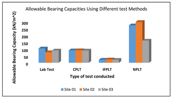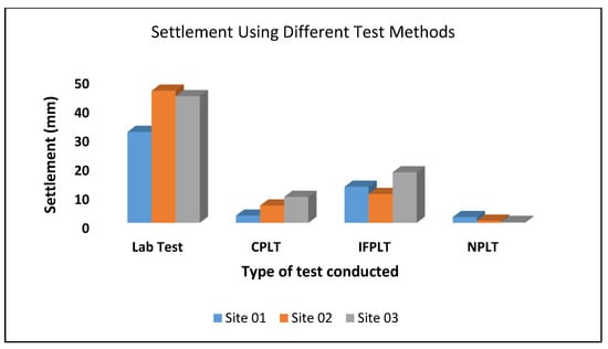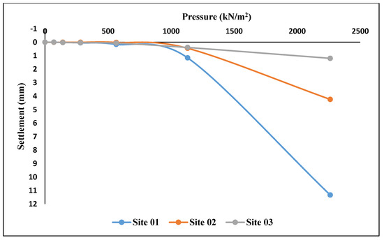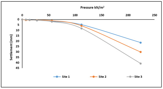 The results from the graph from the innovative field plate load test (IPLT) shows that Site 2 yields a settlement of 10 mm, followed by Site 3, with a settlement of 17.5 mm. Site 1 yields a settlement of 12. 5 mm, as seen in Figure 9. The results of the innovative test are in agreement with the results obtained by [36]. The corresponding allowable bearing capacity shows that Site 2 has an allowable bearing capacity of 24.5 kN/m2, Site 1 has an allowable bearing capacity of 22.5 kN/m2 and Site 3 has the lowest allowable bearing capacity of 21.75 kN/m2 [10,37], as presented in Table 6.