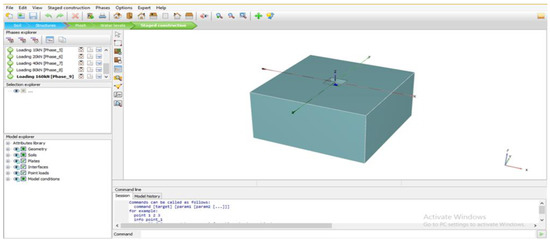 PLAXIS 3-D is a finite element software package known as the numerical Plate Load Test (NPLT) and is widely used for geotechnical engineering. It provides a 3-D model capability that can be applied for various geotechnical engineering analyses. The 3-D Mohr–Coulomb model was used because the 2-D axisymmetric model was not sufficient to represent the geometry because the bearing plate reached a considerable punch depth to create the finite strains. The soil geometry of the boundary condition of 5 m by 5 m and pit dimensions of 1.5 × 1.5 m and a depth of 0.5 m was excavated. The dimension of the pit is five times the diameter of the plate size. The PLAXIS 3-D software model uses soil skeleton of the subgrade layer, which provides soil behavior under different loading conditions. This program develops a 3-D subgrade model for the load-deformation curve for the plate load test to find the subgrade reaction modulus, settlement and bearing capacity. The software requires soil properties that include shear strength parameters, Poisson’s ratio and the unit weight of soil, as seen in Table 4.