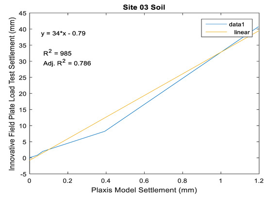 The PLAXIS models depicted in Figure 13 were compared with the experimental results of the IPLTD to achieve a more effective investigation. The results showed evidence that the consistency between the observed behaviour and that of the predicted one by the PLAXIS 3D (Numerical Plate Load Test) model yields relatively high correlation coefficients of (R2 = 0.986) and a linear equation (Equation (3)) expressing the correlations between the independent variable, X, and the dependent variable, Y. The findings are in agreement with [54,55,56,57].