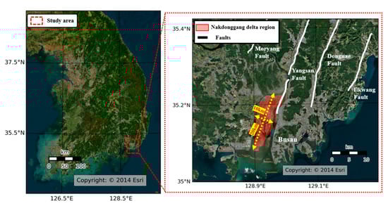 The Nakdonggang delta region is in the southeastern part of the Korean peninsula, as shown in Figure 1. It is the largest delta area in the Korean peninsula and is surrounded by various faults and mountains. An extensional basin was formed by a half-graben structure bounded by the Yangsan fault, as shown in Figure 1. The main delta is approximately 10 km wide and 20 km long, with an exposed land area of around 136 km2, a plains area, and several interdistributary islands []. The southeastern part of the Korean peninsula is known to have a higher seismic hazard compared with the rest of the country [].