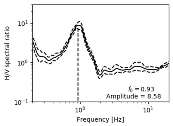 Nevertheless, many studies have confirmed that the peak frequency of microtremor HVSR generally corresponds to the fundamental frequency of the 1D transfer function of each site [,,,]. Bard [] explained that HVSR peaks are very close to the site fundamental frequencies at sites with a strong impedance contrast, because the vertical components of Rayleigh waves tend to vanish near the S-wave resonance frequency. We used the microtremor HVSR method to estimate the f0, and Figure 2 shows a typical example of an HVSR obtained in the study area.