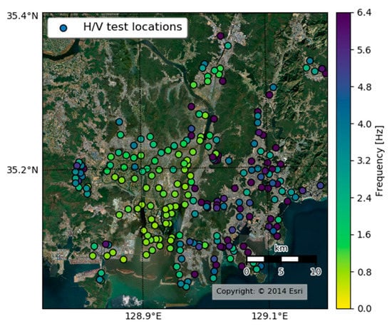 We obtained the HVSR from the obtained microtremors using the Geopsy 2.10.1 software suite (https://www.geopsy.org (accessed on 7 July 2020)), applying the Konno-Ohmachi smoothing method [] with a smoothing constant of b = 40. Within the analysis, the recorded data were divided into multiple time windows of 180 s long and the frequency sampling was done logarithmically from 0.1 to 50 Hz. The value of the f0 was obtained from all time windows and, subsequently, the mean and standard deviation were calculated. Figure 3 also shows the f0 at the studied sites, obtained using the HVSR method described above. Most sites located inside or near the Nakdonggang delta region showed a low f0 of around 1 Hz, while others located near mountains showed higher values.