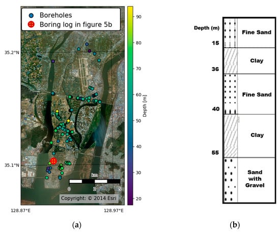 (a) Locations of boreholes and the depth to the bedrock obtained from the Korean geotechnical investigation database system (www.geoinfo.or.kr) in the main delta region. (b) A typical example of collected stratigraphic data in the study area at the location shown in Figure 5a.