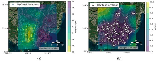 Based on the results of the HVSR, we created an f0 map of the Nakdonggang delta region (Figure 6a) to confirm the spatial distribution of the f0 in the study area. We used the Ordinary Kriging method to spatially interpolate the f0 data of the study area with intervals of around 30 m. We applied a variogram with 3.82, 5.32, and 12,492 as “Sill”, “Nugget”, and “Range”, respectively. The spatial distribution of the variance is illustrated in Figure 6b. Based on the f0 map of the Nakdonggang delta region, we can confirm that most of the study area had an f0 around 1 Hz and showed a relatively small variability compared with other areas.